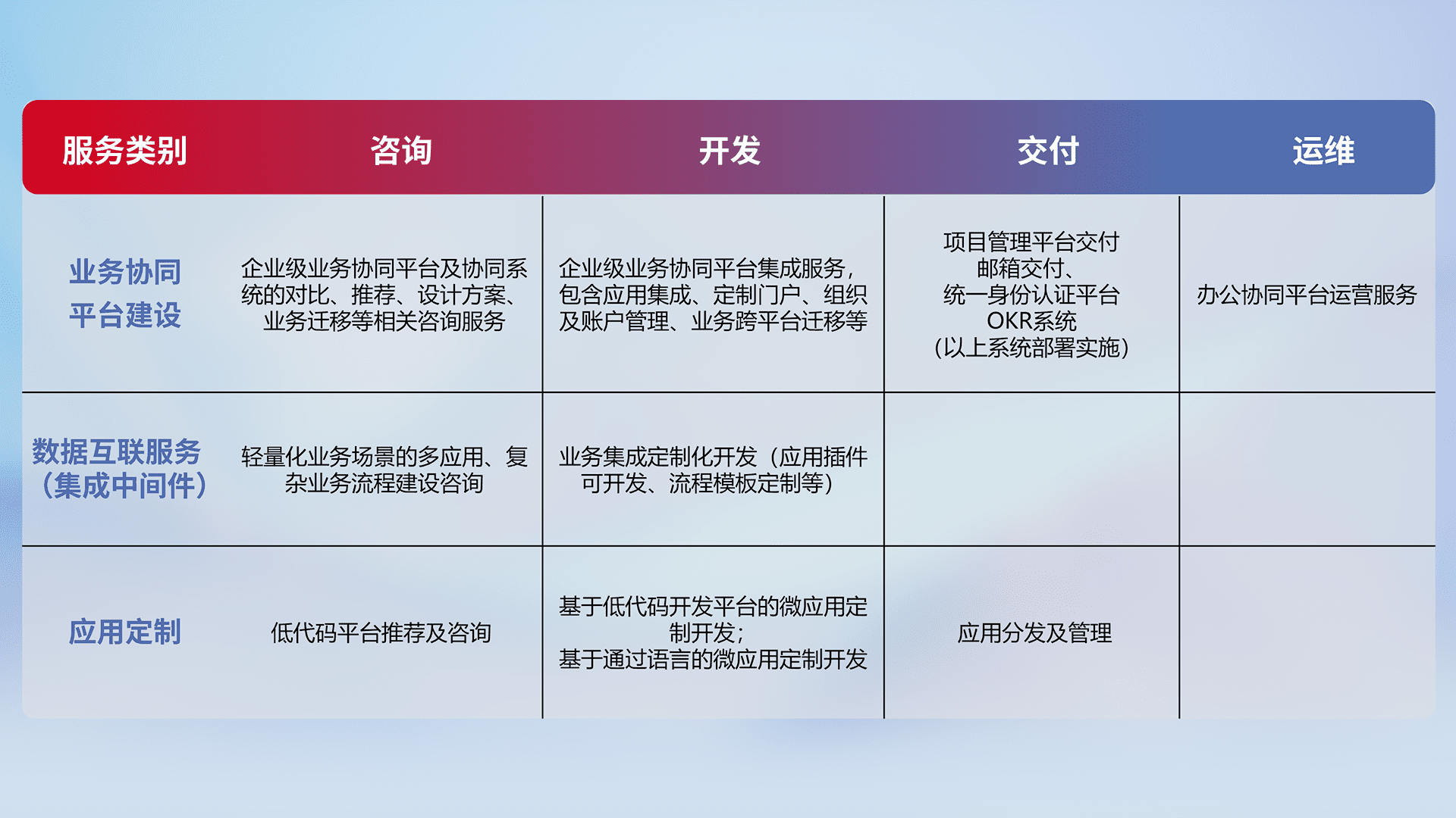 针对钉钉、、、企微、、、、IDaas等平台级产品提供产品的规划、、、方案、、、交付、、定制化开发等服务,,实现如统一协同办公、、、、智能客户服务、、混合会议管理、、、智能数据查询、、、等业务场景,,实现数字化转型。。。
